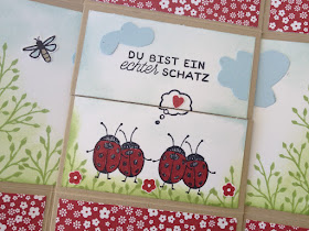 Die zweite Seite ist in Chilli gehalten. Hier wurde mal das Blumen - Designerpapier von mir benutzt (welches die Seite vom Designerpapier ist, die mir eigentlich am wenigsten gefällt). In die Mitte wurden die süßen Käfer gestempelt. Eine Mücke und selbst geschnittene Wolken am Himmel durften auch nicht fehlen. Genau wie wieder ein paar grüne Zweige und ein paar nette Worte.